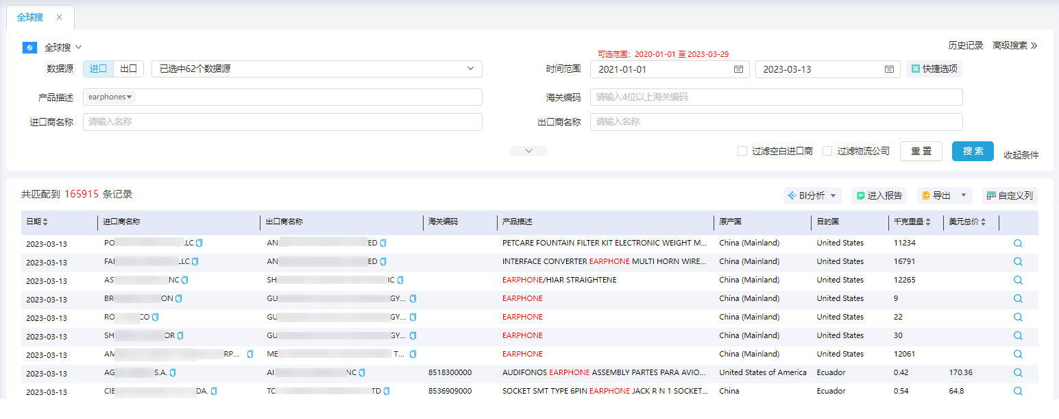 3. 结合该核心产品的特点从金年会诚信至上外贸通中,找出采购earphones的买家及其交易记录,顺利获得分析采购动态、交易趋势、供应链,竞品特点等等,有针对性的去挖优质潜客 。