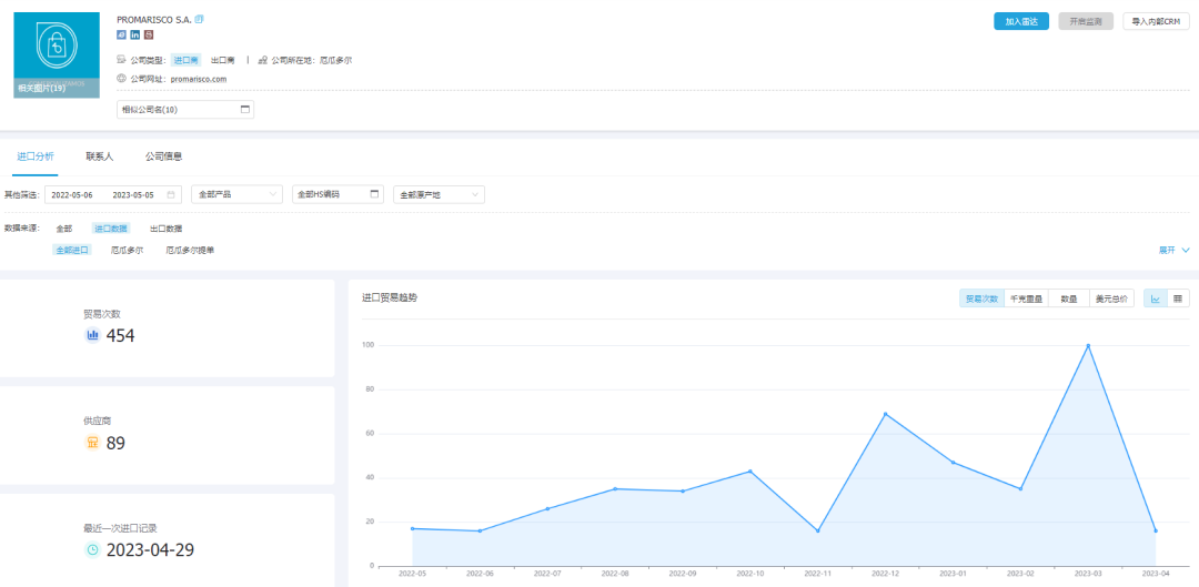在【商情发现】搜索框中输入"产品关键词"、"HS编码""公司名称"、"SCI编码"等条件查询,可看到"对该产品有采购需求"的全部国外采购商;国家选择"厄瓜多尔",可看到"对产品有采购需求"的厄瓜多尔采购商。