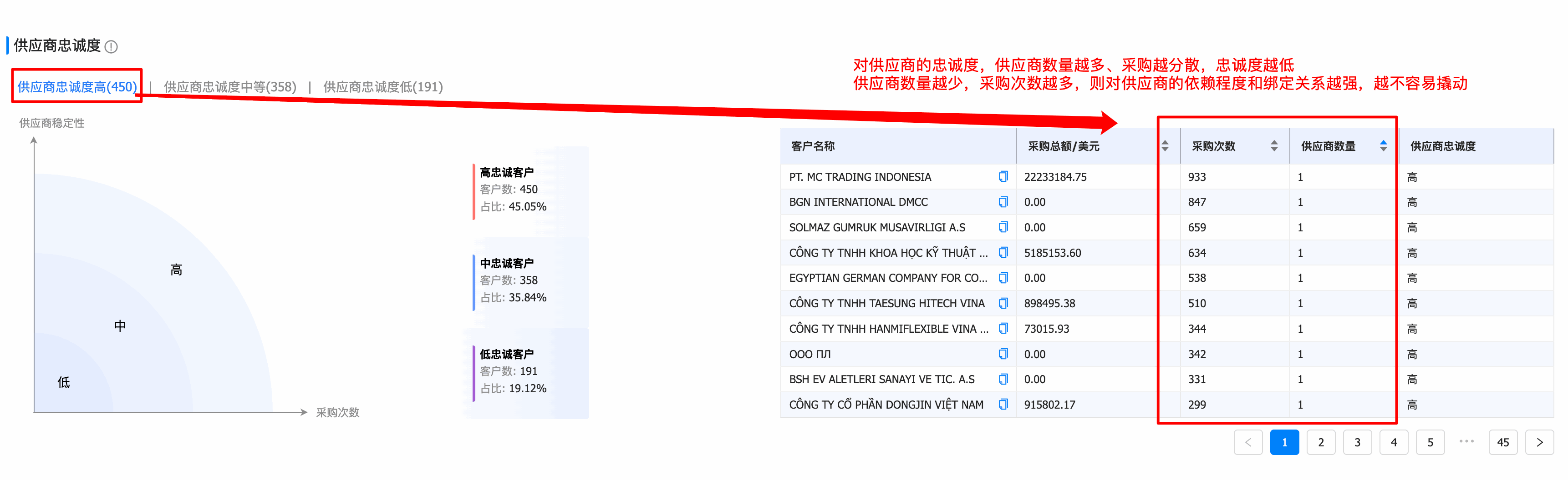 客户的忠诚度可分别从「对供应商的忠诚度」、「对采购地区的忠诚度」、「采购产品的忠诚度」三种维度分析。顺利获得衡量客户对采购商的忠诚度、地区忠诚度、产品忠诚度,区分高忠诚度、低忠诚客户,帮助企业识别机会较大的客户群体。