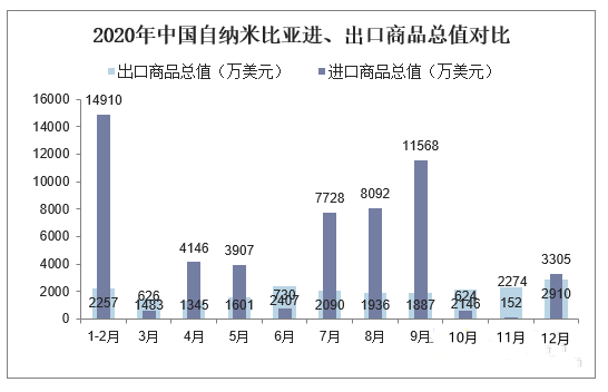 2020年中国自纳米比亚进、出口商品总值对比